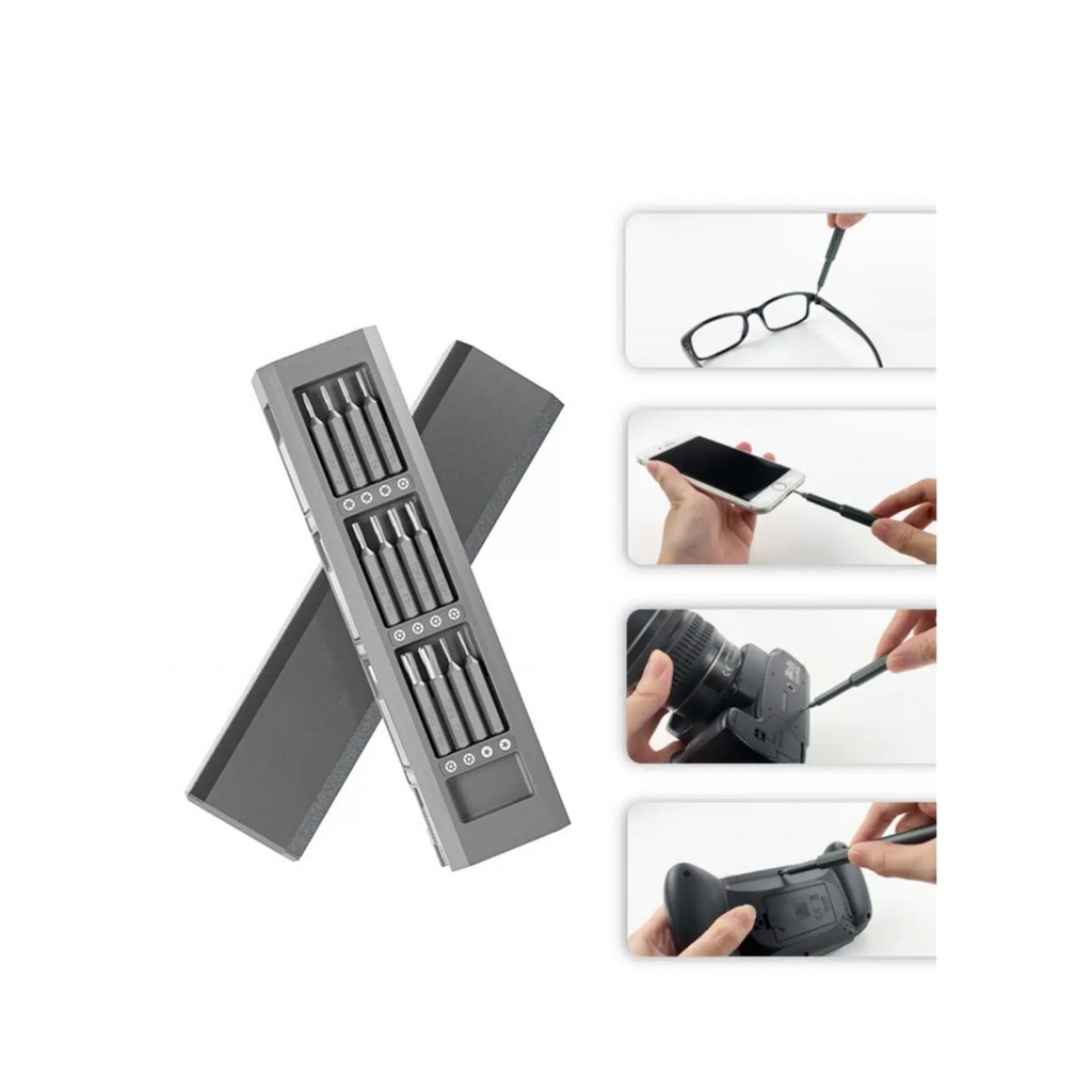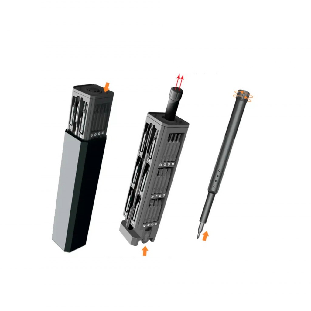 این طراحی مهندسیشده نهتنها دسترسی سریع به ابزارها را فراهم میکند، بلکه تجربهای مدرن و لذتبخش از استفاده یک مجموعه حرفهای را رقم میزند. درون این جعبه، یک پیچگوشتی آلومینیومی خوشدست با طول ۱۲.۵ سانتیمتر قرار دارد که برای کارهای دقیق دیجیتال ایدهآل است. همچنین سیستم اتصال مغناطیسی سریها باعث میشود که تعویض آنها بدون لغزش و با اطمینان کامل انجام شود. این محصول برای باز کردن قاب گوشیهای ظریف، تعمیر ساعت هوشمند و یا کنترلر بازی نیز کاربرد دارد.