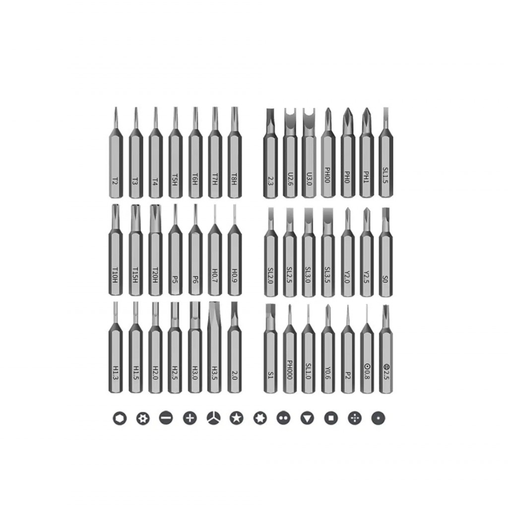 در قلب این مجموعه، ۴۲ عدد سری دقیق با طول استاندارد ۲۸ میلیمتر قرار دارد که از آلیاژ S2 مقاوم ساخته شدهاند. این سریها طوری انتخاب شدهاند که برای باز کردن انواع دستگاههای دیجیتال کاربرد داشته باشنداز پیچهای ریز گوشی و لپتاپ گرفته تا پیچهای خاصتر در هدفون، ساعت هوشمند یا اسباببازیهای الکترونیکی را پوشش میدهند. سریهای دوسو، چهارسو، ستارهای، ششپر، پنجپر، سهپر، Y شکل، مربعی و حتی سریهای امنیتی خاص همگی در این مجموعه موجودند و بدون نیاز به ابزار جانبی، میتوانند پاسخگوی نیاز شما باشند. اتصال مغناطیسی بین سریها و دسته هم بهگونهای طراحی شده که حین کار لق نزند و باعث خستگی یا آسیب به پیچها نشود.
