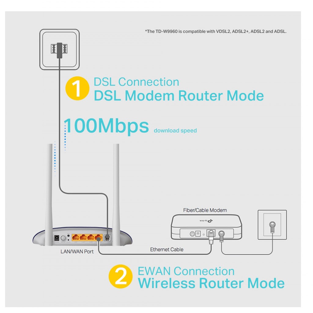 TD-W9960 با VDSL2، ADSL2+، ADSL2 و ADSL سازگار است.