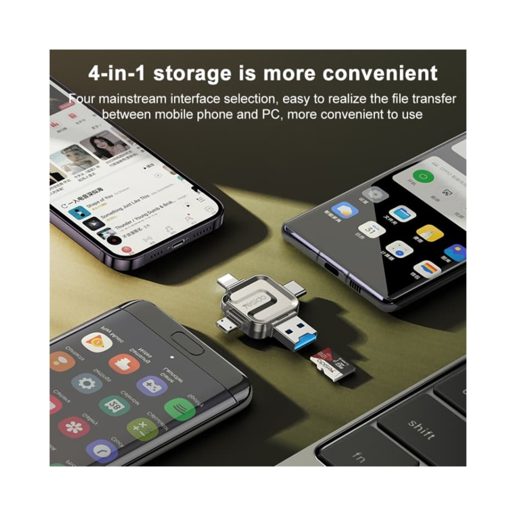 چندکاره بودن این محصول قادر است به چهار رابط متفاوت متصل شود: USB معمولی، Type-C، Micro USB و Lightning (برای دستگاههای اپل). همچنین به کارت حافظه Micro SD دسترسی میدهد.