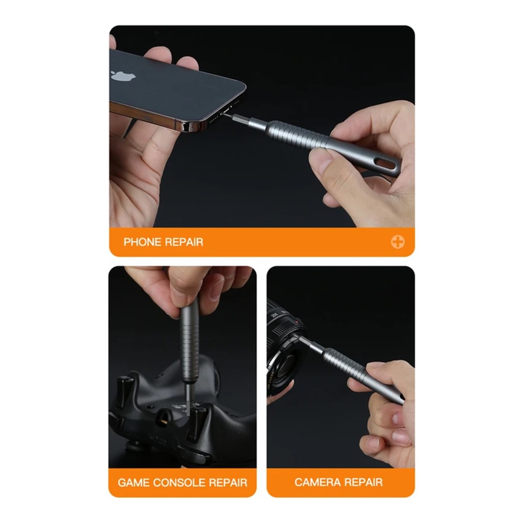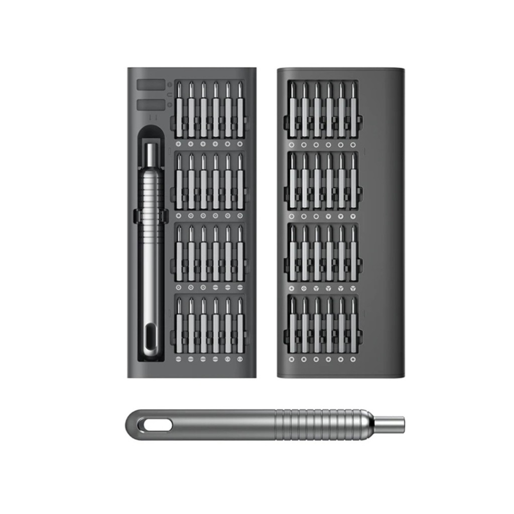 این محصول یک دستهی پیچگوشتی دارد که در عین ظرافت در تولید و طراحی از دوام و مقاومت بسیار خوبی نیز برخوردار است. این دسته از روکش ضد زنگ بهره میبرد و برای کارهای مختلفی از جمله تعمیرات عینک، محصولات الکترونیکی، اسباببازی، تلفن، لپتاپ، موبایل و غیره مورد استفاده قرار میگیرد. سری های پیچ گوشتی این محصول از آلیاژ آلومینیوم ساخته شده و دارای حالت مغناطیسی است تا پیچهای کوچک را جذب کرده و از گم شدن آنها جلوگیری کند. دستهی پیچگوشتی این مجموعه نیز از آلیاژ آلومینیوم ساخته شده و در تولید آن از فناوری اکسیداسیون آنودایز استفاده شده تا دوام و مقاومت بسیار خوبی در برابر ضربه و خوردگی داشته باشد. این سریها با قابلیت آهنربایی با استفاده از فولاد و تراشکاری لیزری تولید شدهاند. دقت بسیار بالا در تولید این سریها منجر به تولید محصول بسیار با کیفیت شده است. میزان مقاومت بسیار بالا در برابر سایش و خوردگی را میتوان هنگام کار با آنها تجربه کرد. این مجموعه در یک کاور با جنس آلیاژ آلومینیوم قرار دارد. داخل این کاور به 4 قسمت تقسیم شده و سریهای مختلف پیچگوشتی با کاربردهای گسترده در جای مشخص قرار دارند. پردازش ریختهگری یکپارچه در تولید این کاور سبب ایجاد قوسهای بسیار چشمنواز و مدرن در ساختار آن شده است. این کاور خوشساخت در برابر ضربه و خوردگی مقاومت بسیار خوبی دارد. گفتنی است این کاور به صورت کشویی بوده و دسترسی بسیاری آسانی به تمامی سریهای پیچگوشتی خواهید داشت.