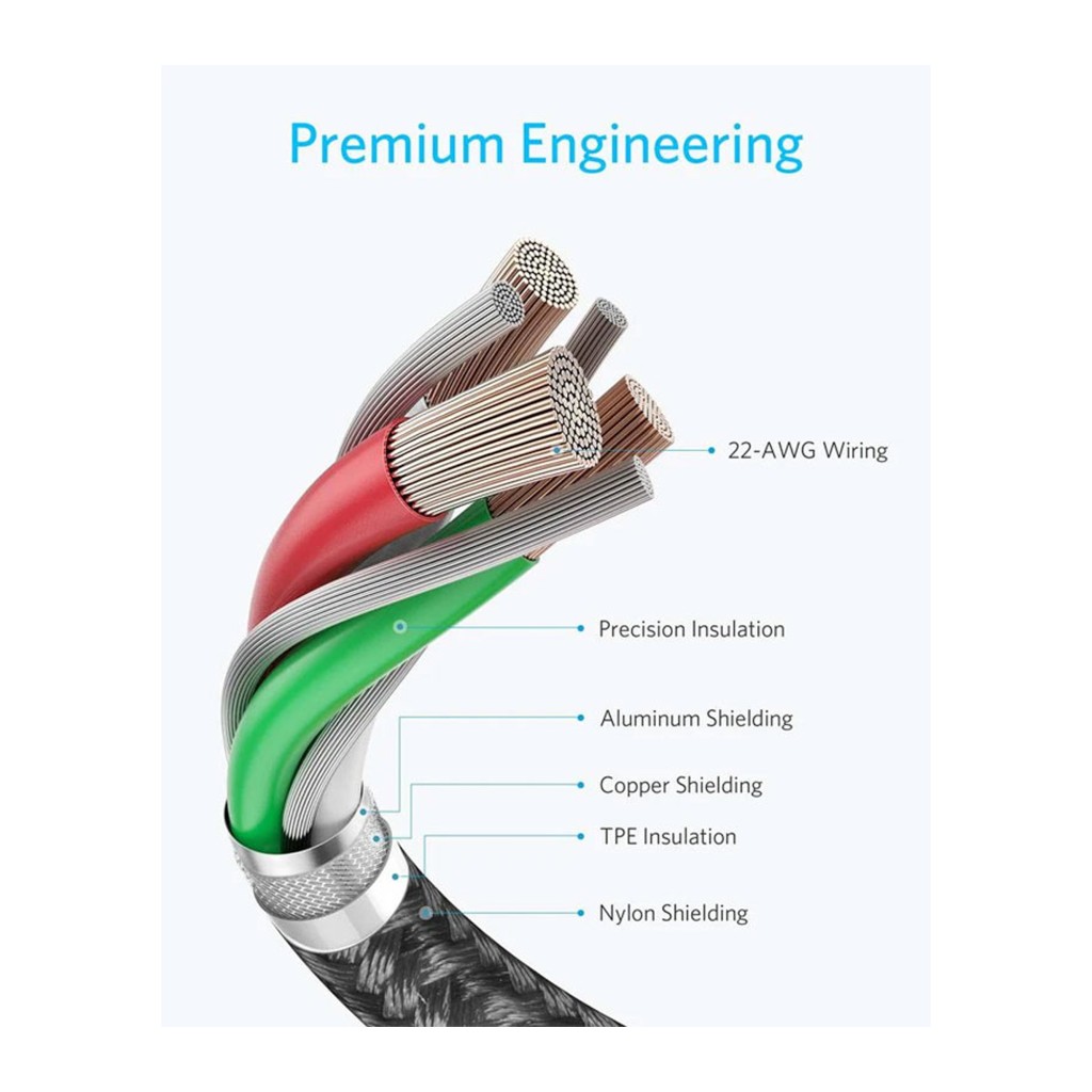 جنس روکش کابل: نایلون بافتهشده (Nylon Braided) با کیفیت بالا، که مقاومت فوقالعادهای در برابر گره خوردن، کشش و فرسایش ایجاد میکند.